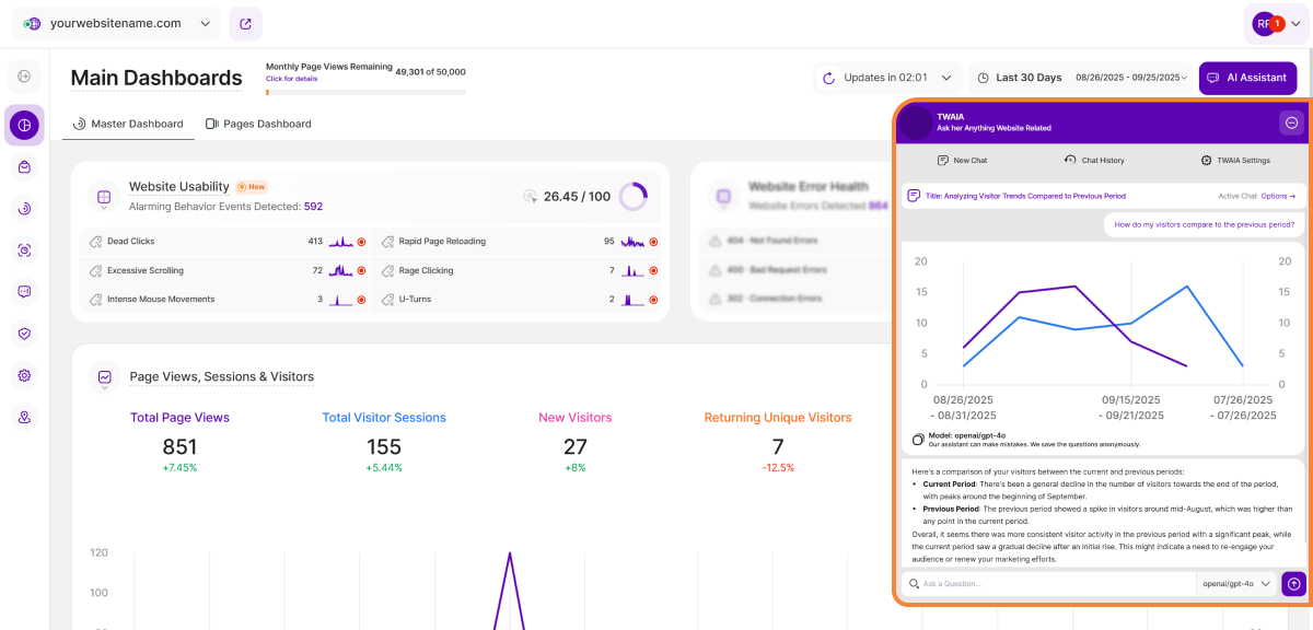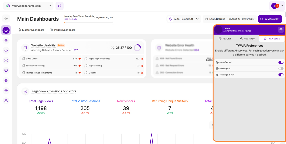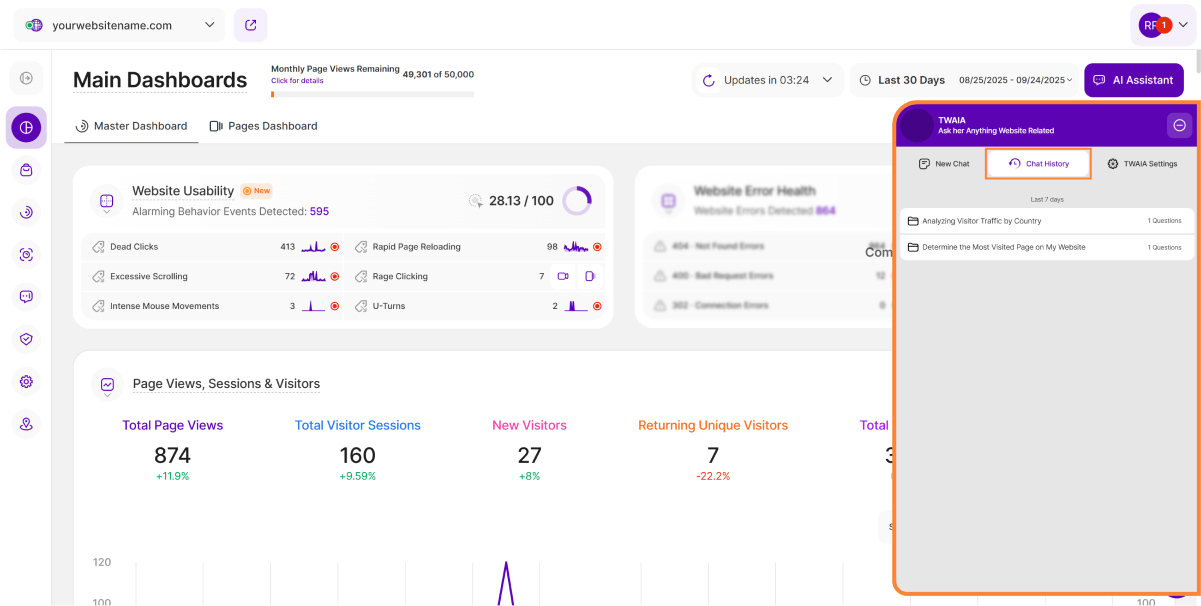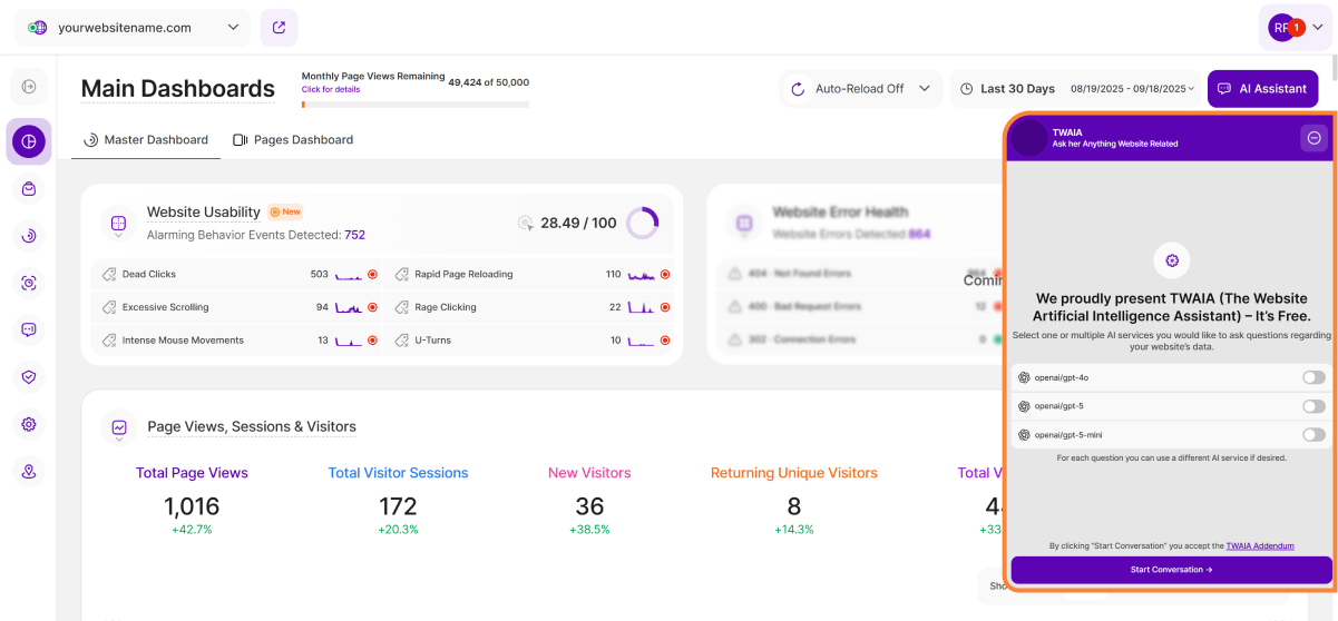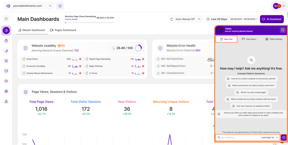 Der KI-Assistent befindet sich in der oberen rechten Ecke des Dashboards, direkt neben dem Datumspicker. Wenn Sie auf diese Schaltfläche klicken, öffnet sich ein von rechts einschiebbares Modal, das TWAIA, unseren KI-gestützten Plattformassistenten, enthält.