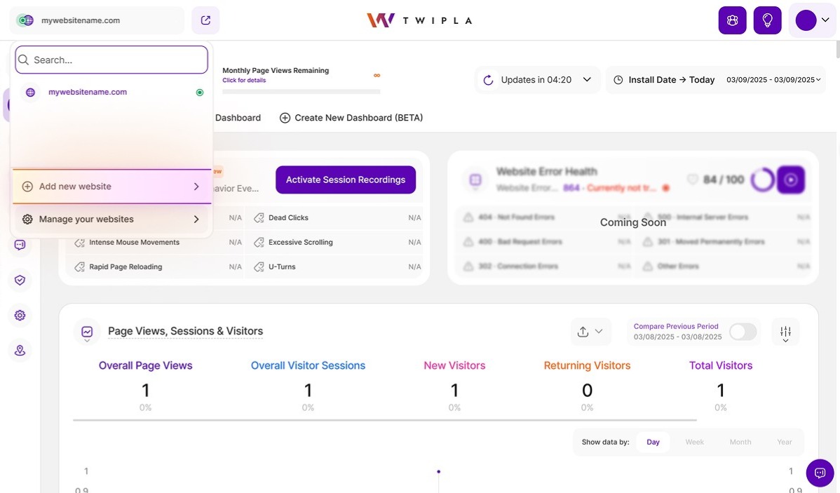 Um eine Weebly-Webseite effektiv zu verwalten, müssen Webseiten-Besitzer jedoch den Traffic ihrer Webseite verfolgen. Weebly verfügt zwar nicht über integrierte Analysefunktionen, aber es sind Plugins verfügbar, wie z. B. TWIPLA, die sich nahtlos in Weebly integrieren lassen. Einmal installiert, bietet TWIPLA die folgenden Einblicke und Funktionen für eine bessere Verwaltung der Webseite: