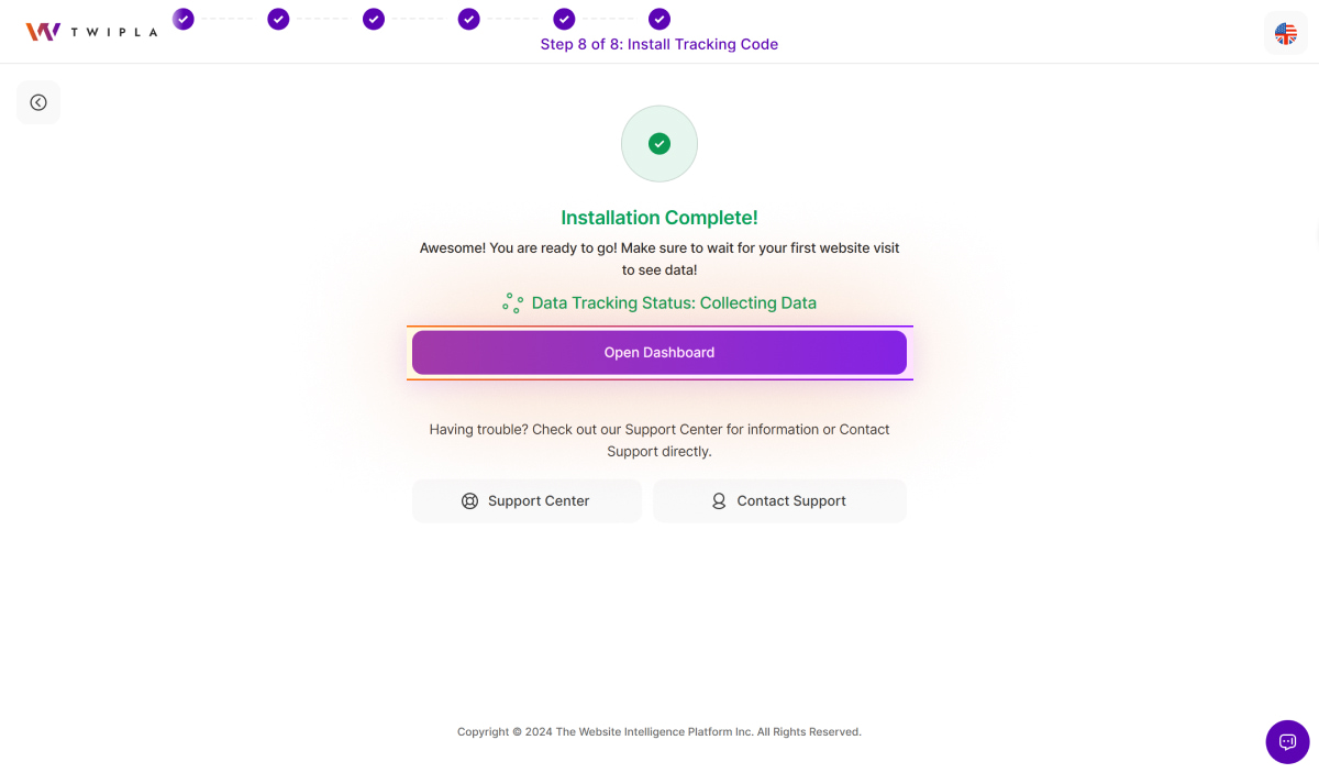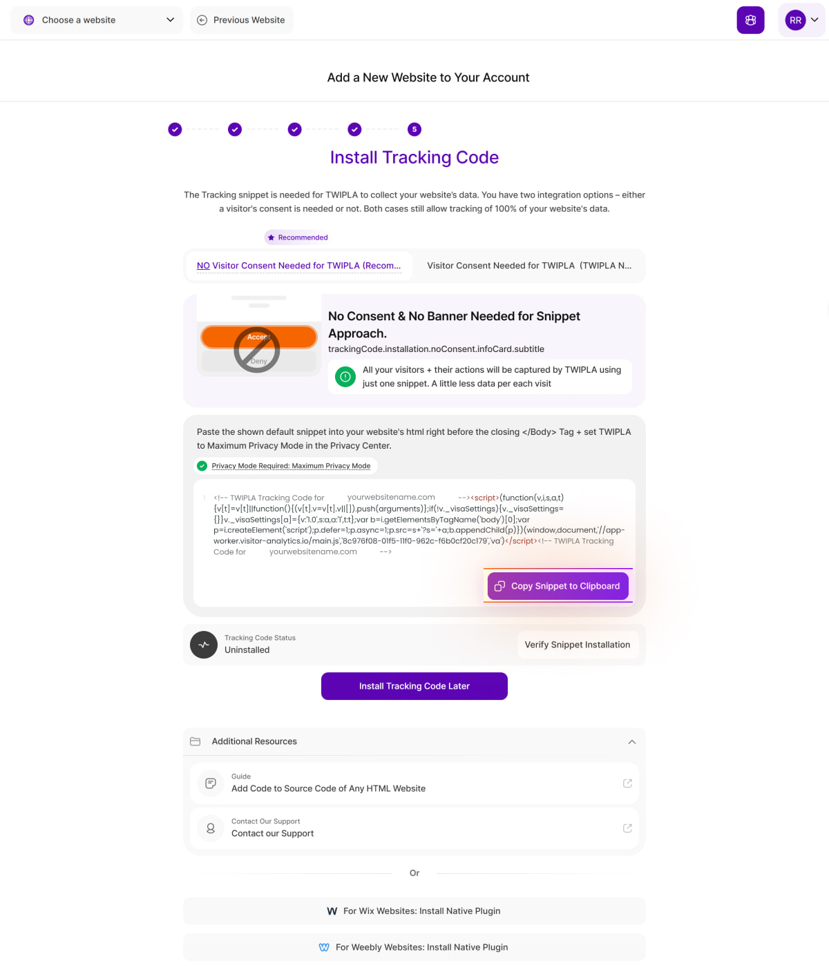 6. TWIPLA benötigt ein Tracking-Snippet, um Daten von Ihrer Website zu sammeln. Wählen Sie zwischen zwei Integrationsmethoden: Mit der einen Methode können Sie Daten ohne Zustimmung der Besucher sammeln. Die andere Methode erfordert die Zustimmung der Besucher. Beide Methoden erfassen 100% der Daten Ihrer Website. Kopieren Sie den gewünschten Tracking-Code und fügen Sie ihn vor dem letzten ''-Tag des Quellcodes Ihrer Website ein. Vergessen Sie nicht, die Änderungen zu veröffentlichen. Weitere Informationen zur Installation von Tracking-Codes finden Sie hier.