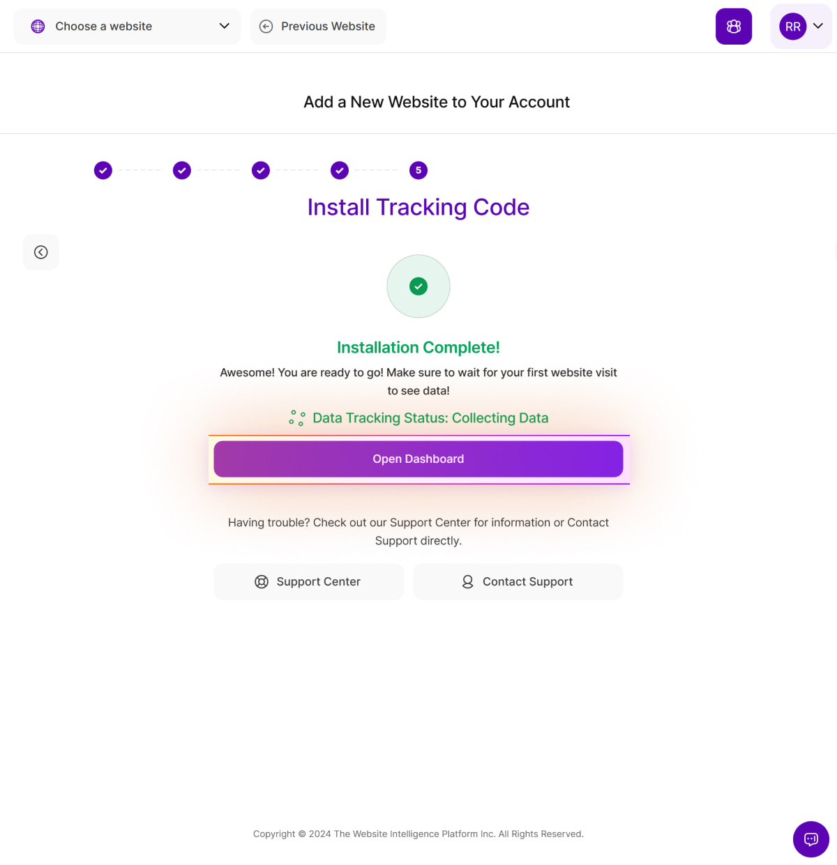 15. Klicken Sie auf Dashboard öffnen, um auf die Haupt-Dashboards zuzugreifen. Sie können Ihre Live-Website besuchen, um die Erfassung der Website-Besuche auf der Plattform zu überprüfen, und das Dashboard neu laden, um Ihre ersten Statistiken zu sehen.