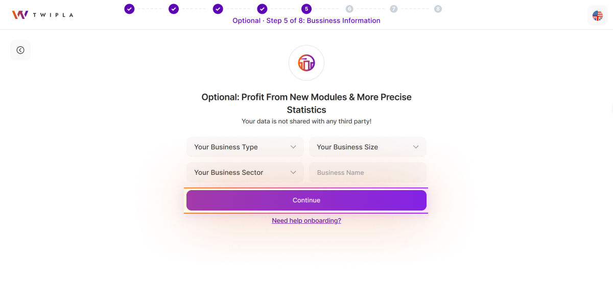 7. Dieser Schritt ist optional. Erhalten Sie Zugang zu neuen Modulen und detaillierteren Statistiken (z.B. Wettbewerbsvergleich), indem Sie Ihren Unternehmenstyp, Ihre Größe, Ihre Branche und Ihren Firmennamen eingeben. Diese Daten bleiben selbstverständlich vertraulich und werden nicht an Dritte weitergegeben!