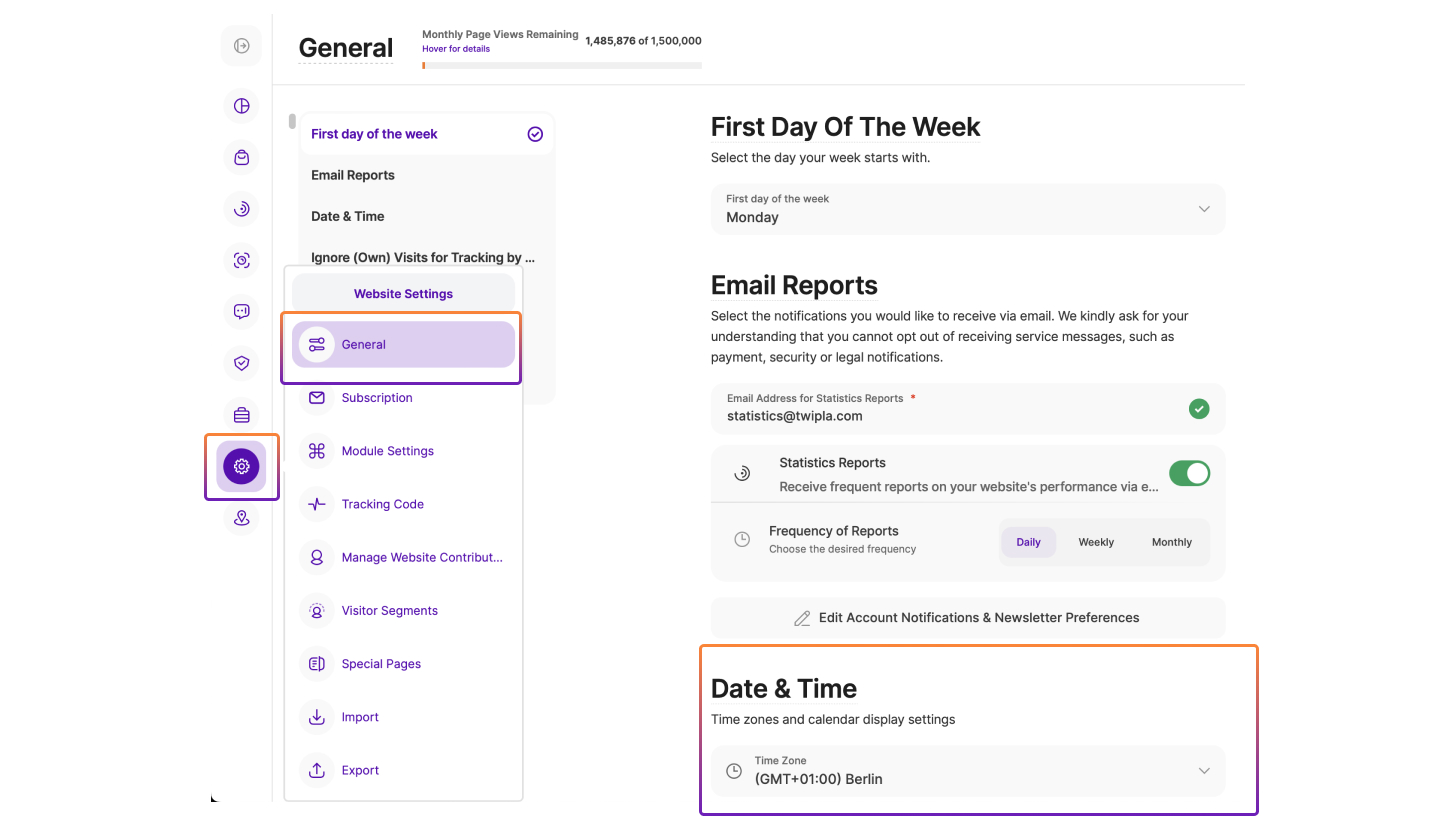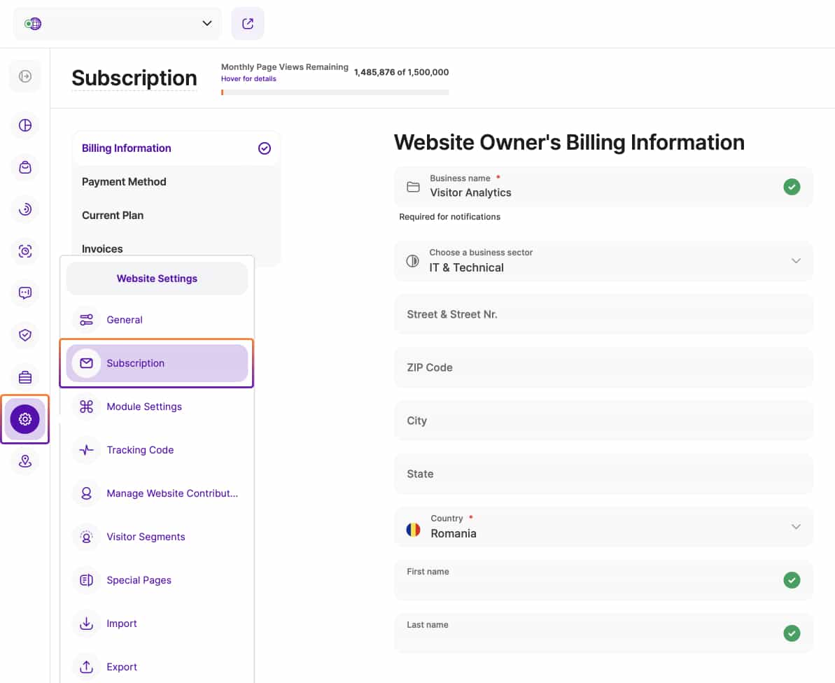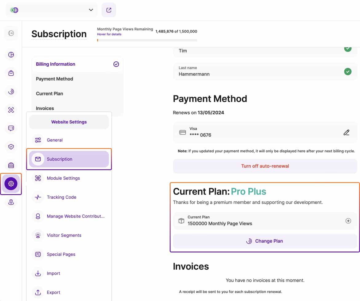 • Gehen Sie zu Webseiten-Einstellungen im linken vertikalen Symbolmenü und klicken Sie auf Abonnement.