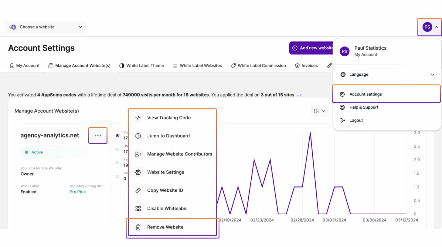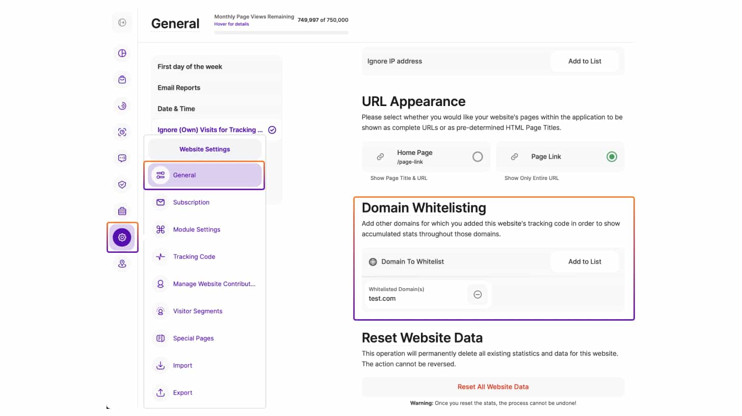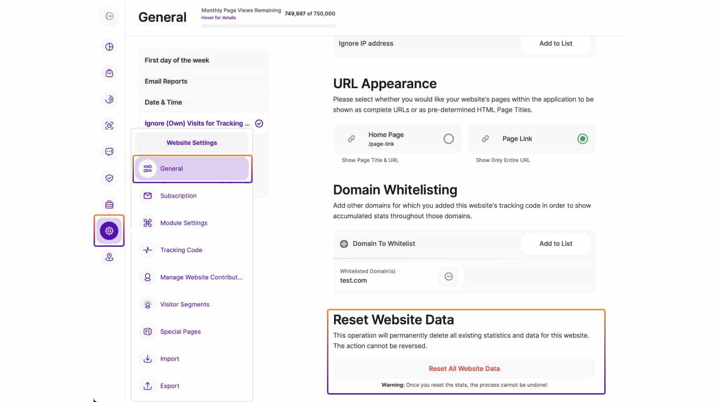 • Gehen Sie zu Webseiten-Einstellungen im linken vertikalen Symbolmenü und klicken Sie auf Abonnement.