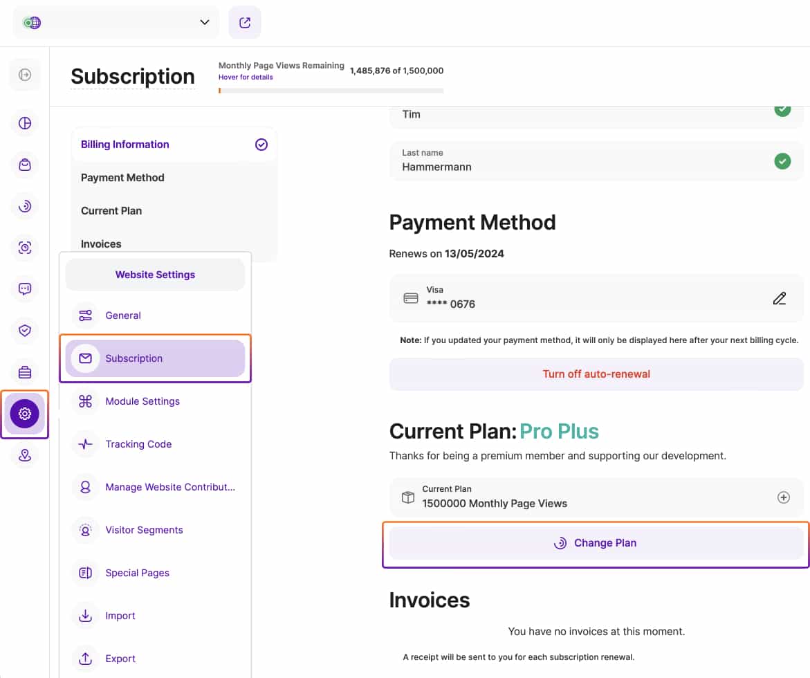 Tipp: Es ist ratsam, Ihren Zahlungsplan regelmäßig zu überprüfen, um sicherzustellen, dass er mit Ihren geschäftlichen Anforderungen übereinstimmt, dass Sie die benötigten Funktionen haben und dass Sie nicht zu viel für Website Intelligence bezahlen.
