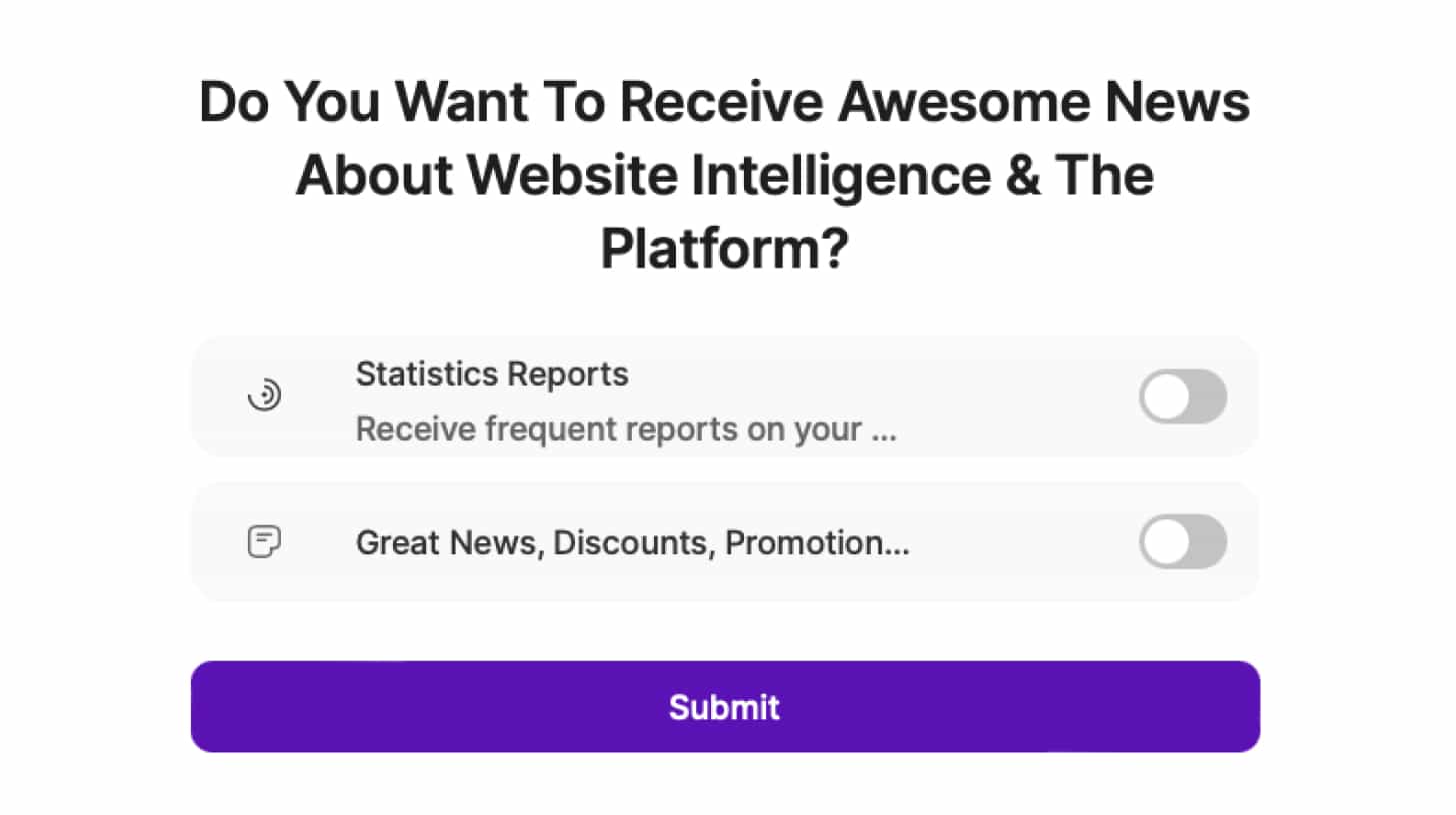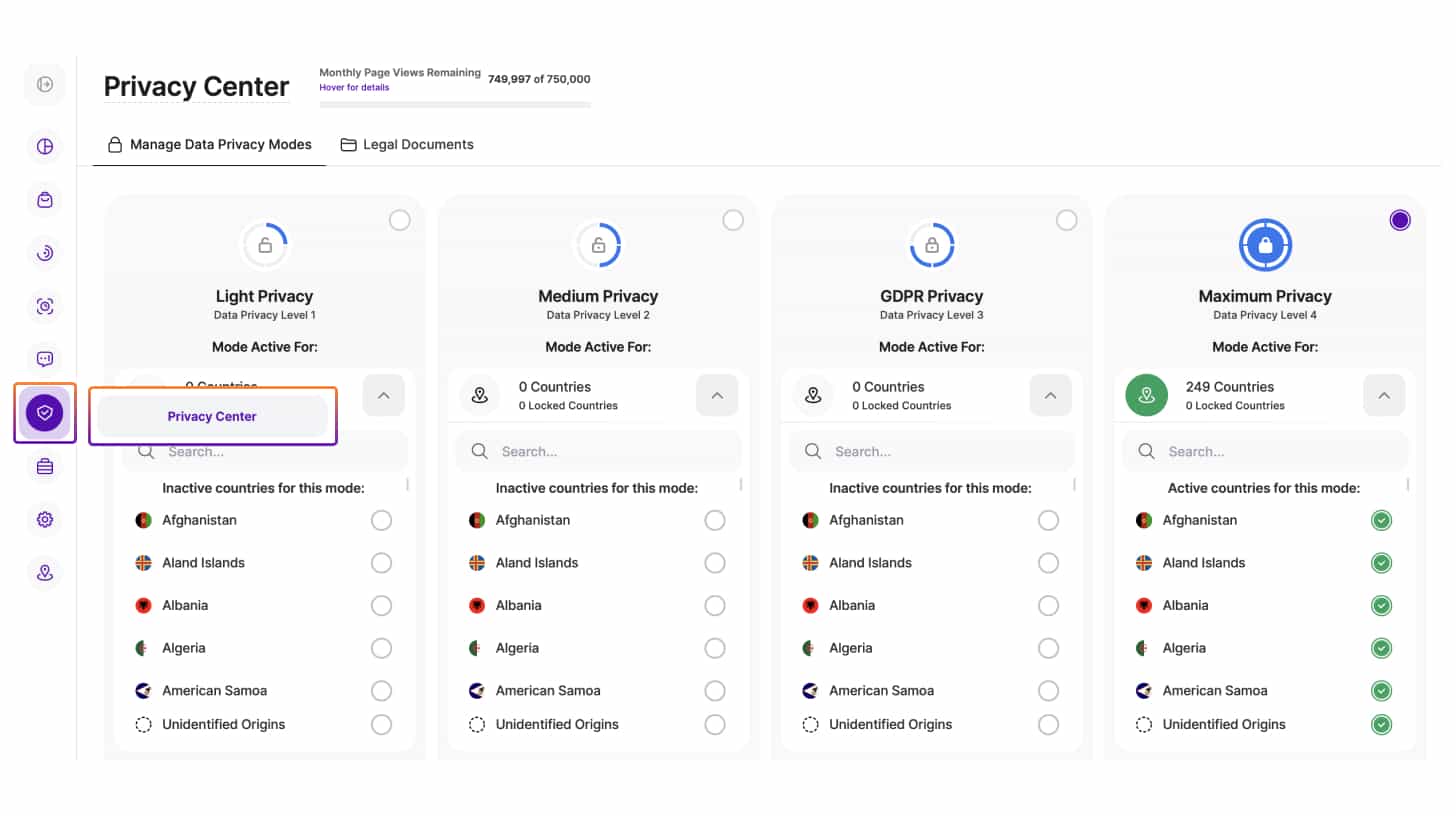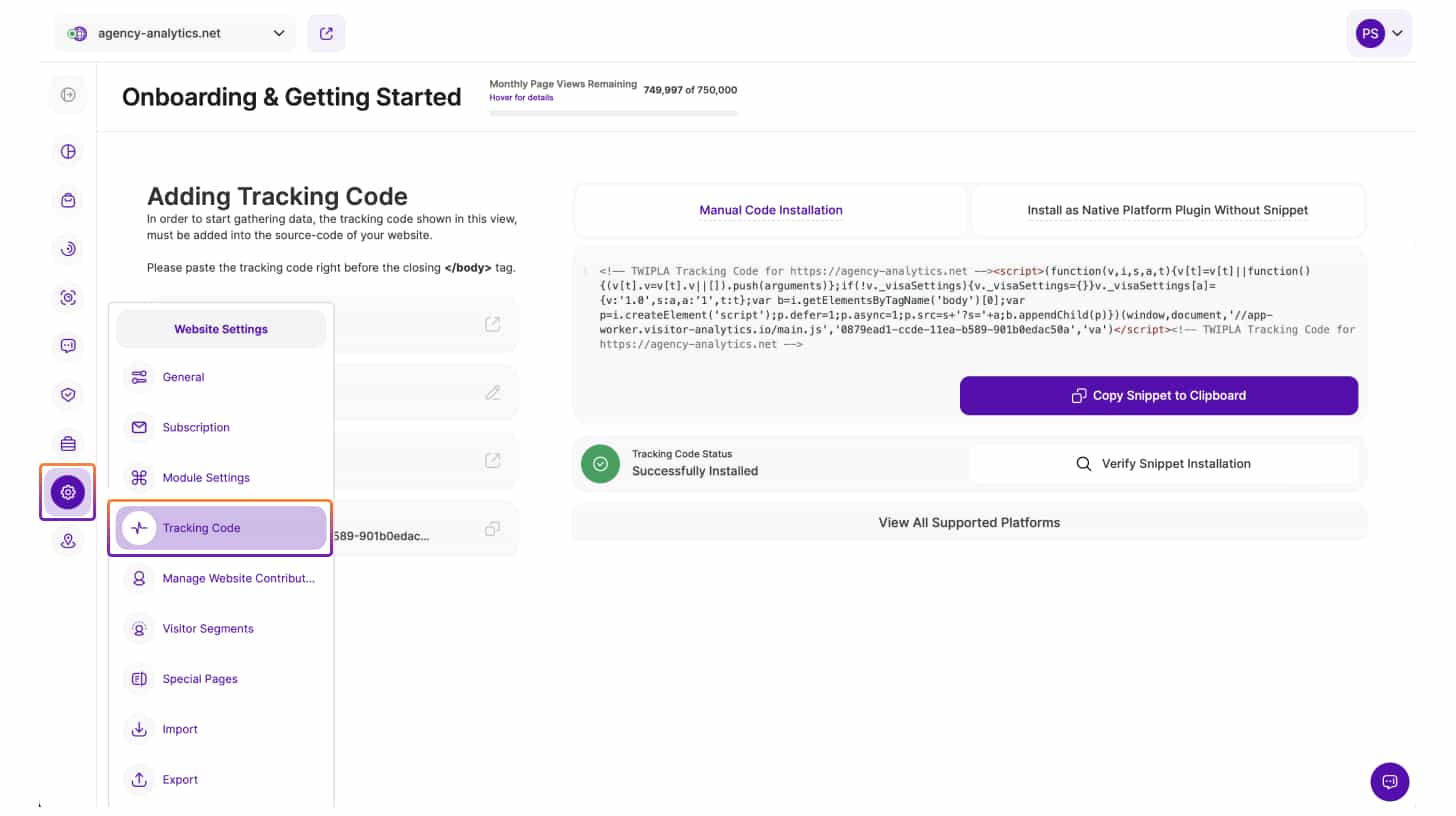 Sobald Sie wissen, welches Paket das richtige für Sie ist, können Sie ein Konto eröffnen (Sie können jedoch jederzeit ein Upgrade oder Downgrade vornehmen). Damit beginnt der Einführungsprozess, der dafür sorgt, dass das Toolkit auf allen Zylindern läuft. Der Anmeldeprozess ist in zwei Schritte unterteilt; der erste passt das Onboarding an die technische Umgebung Ihrer Webseite an, während der zweite die Paketauswahl, die E-Mail-Verifizierung, die Eingabe der Webseiten-URL, die Datenschutzkalibrierung, die Benachrichtigungseinstellungen und die Installation des Tracking-Codes umfasst. Weitere Informationen zur Integration mit anderen Plattformen finden Sie im Support Center.