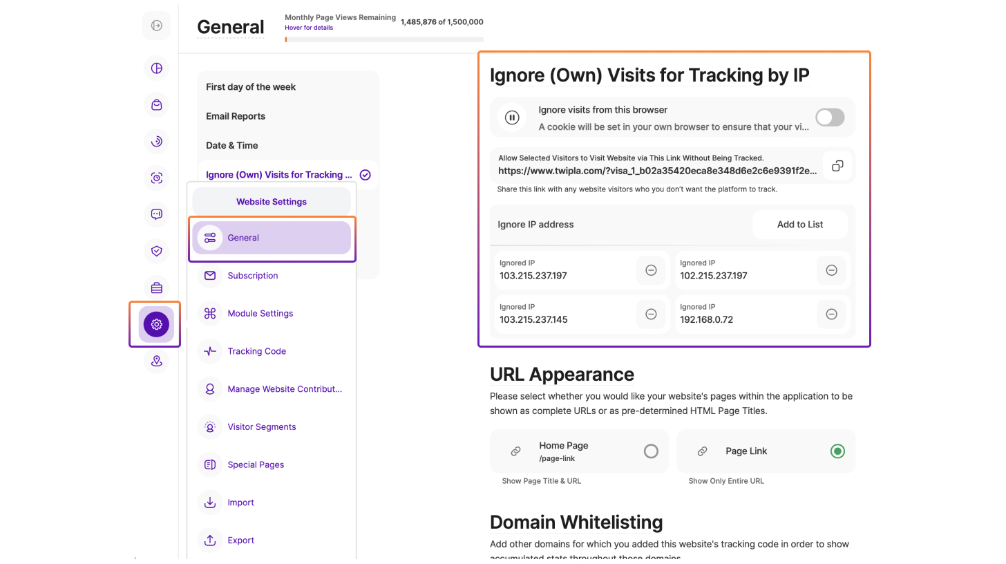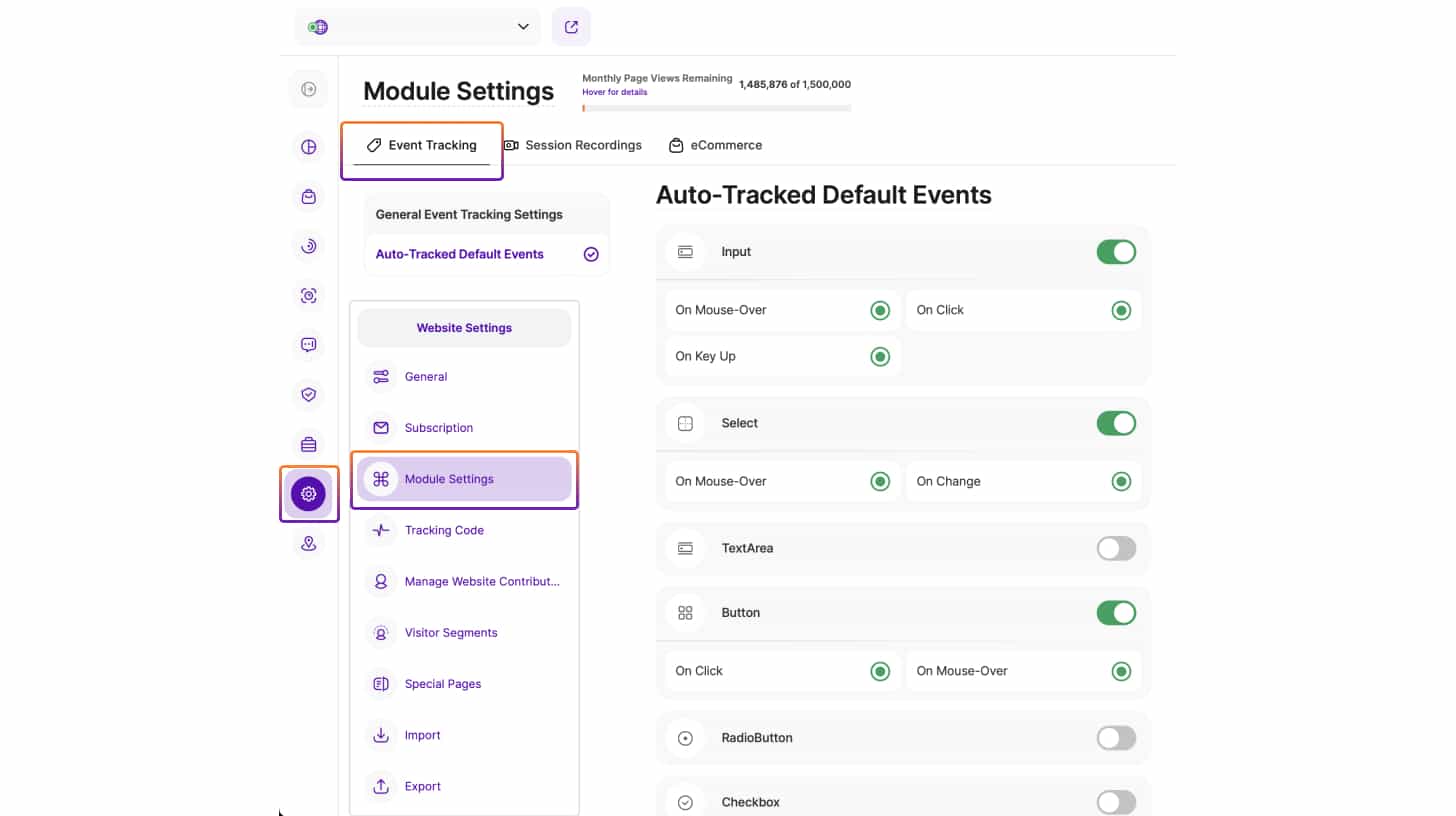 • Stellen Sie sicher, dass die manuelle Ereignisverfolgung aktiviert ist. Gehen Sie zu Webseiten-Einstellungen im vertikalen Menü auf der linken Seite. Klicken Sie auf Moduleinstellungen. Schalten Sie die Option Manuell erstellte Ereignis-Tags verfolgen ein.