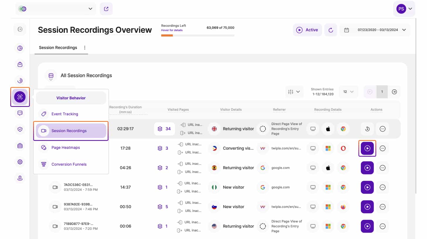 • Gehen Sie zu Besucherverhalten im vertikalen linken Symbolmenü und klicken Sie auf Sitzungsaufzeichnungen.