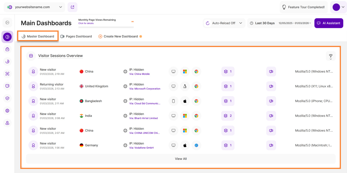 Ready to explore? The dashboard tour is always at your fingertips! Tap the "Start Tour!" or "Feature Tour Completed!" button in the top right corner of the Main Dashboards to get started.