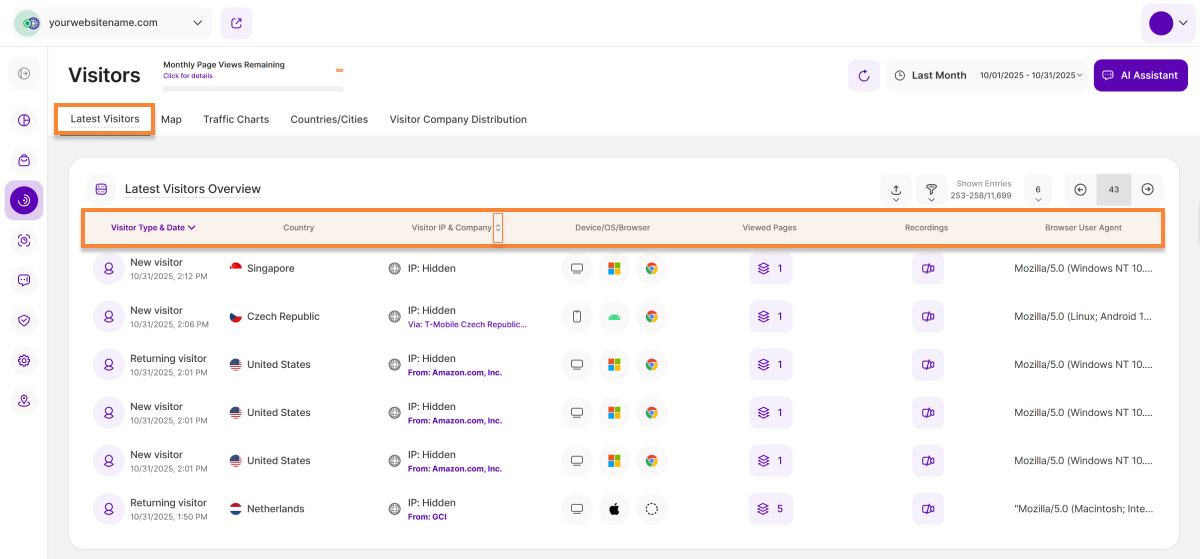- Visitor IP & Company: Displays the unique IP address. You can now easily sort this column by clicking the column header. Choose ascending or descending order. Hint:The Company Reveal feature is available if you are subscribed to the minimum pricing plan. This feature analyzes IP addresses against company-owned ranges: if a match is found, the Company name is displayed; otherwise, only the Internet Service Provider (ISP) is shown. Hover over the company name or ISP to reveal the overall count of page views originating from this IP within the selected time period.