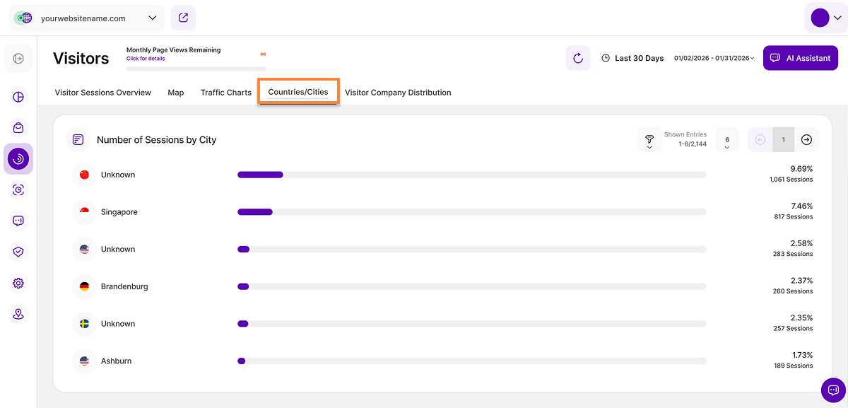 - Total Number of Sessions: Below the percentage, the total number of sessions for that specific city is displayed.