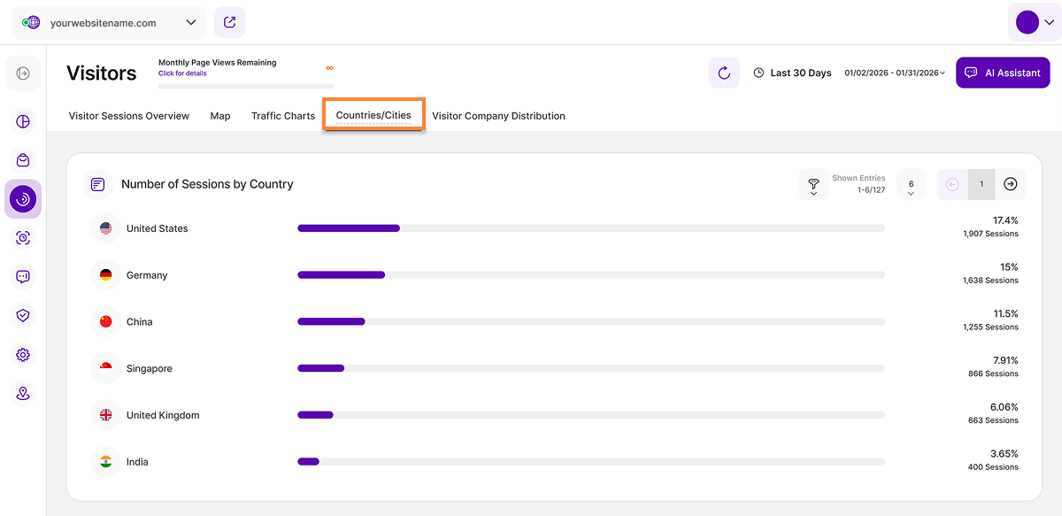 - Country: Displays the flag and country of the visitor's session. Hovering over the flag reveals a location icon, and clicking it directs you to the map view.