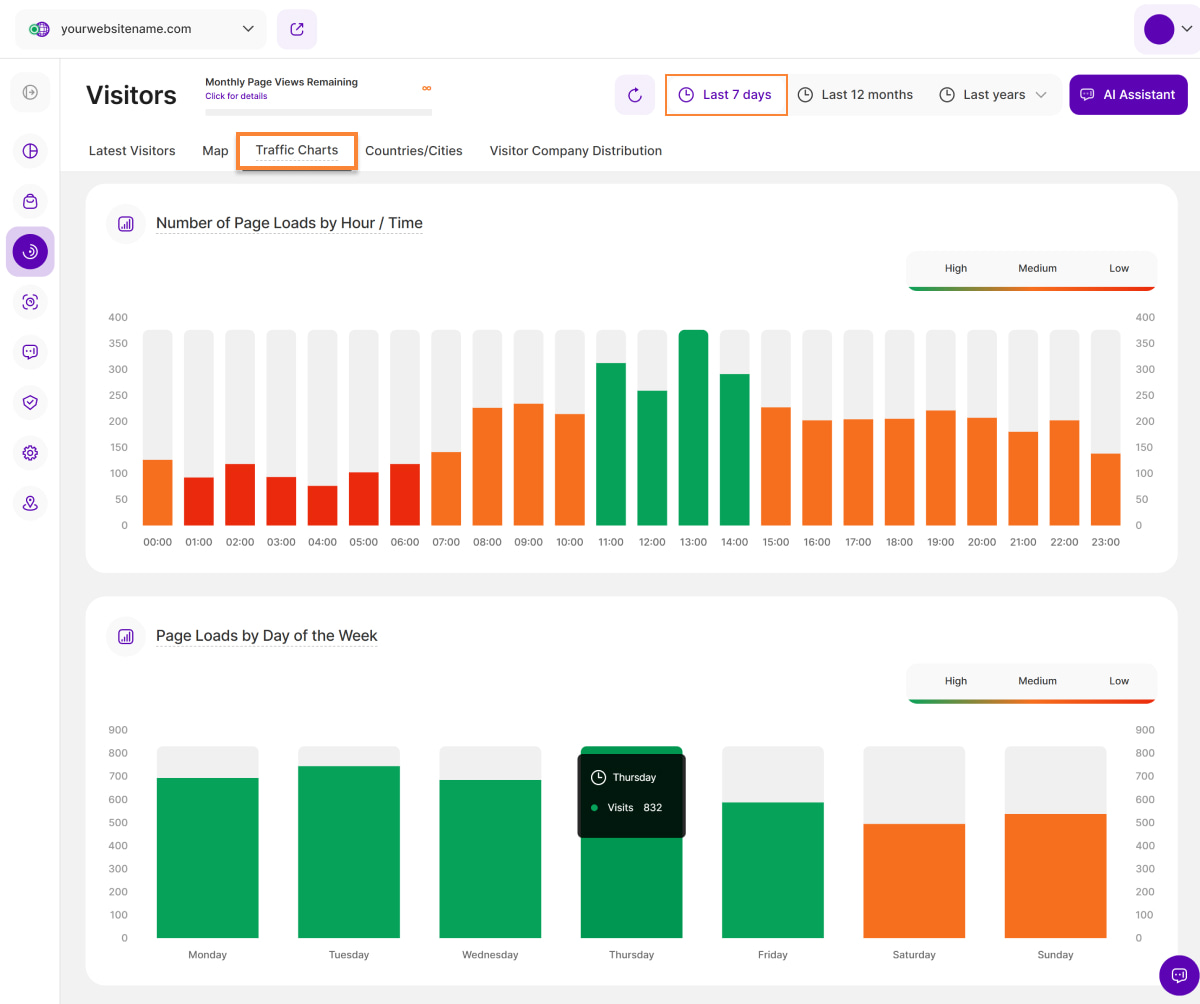 - Number of Page Loads by Hour / Time: This graph presents the distribution of page loads on an hourly scale, based on the selected time range. It allows you to understand at what times of the day your website experiences the highest and lowest page loads. This supports the data shown in the "Number of Visitors by Hour / Time" graph.