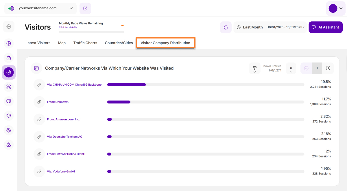 The list highlights the companies or carrier networks that have contributed the most to your website's traffic, sorted with the highest percentage first. Understanding this distribution can help you assess the effectiveness of your marketing efforts, identify potential business partners or customers, and gain insights into the geographical reach of your website's audience.