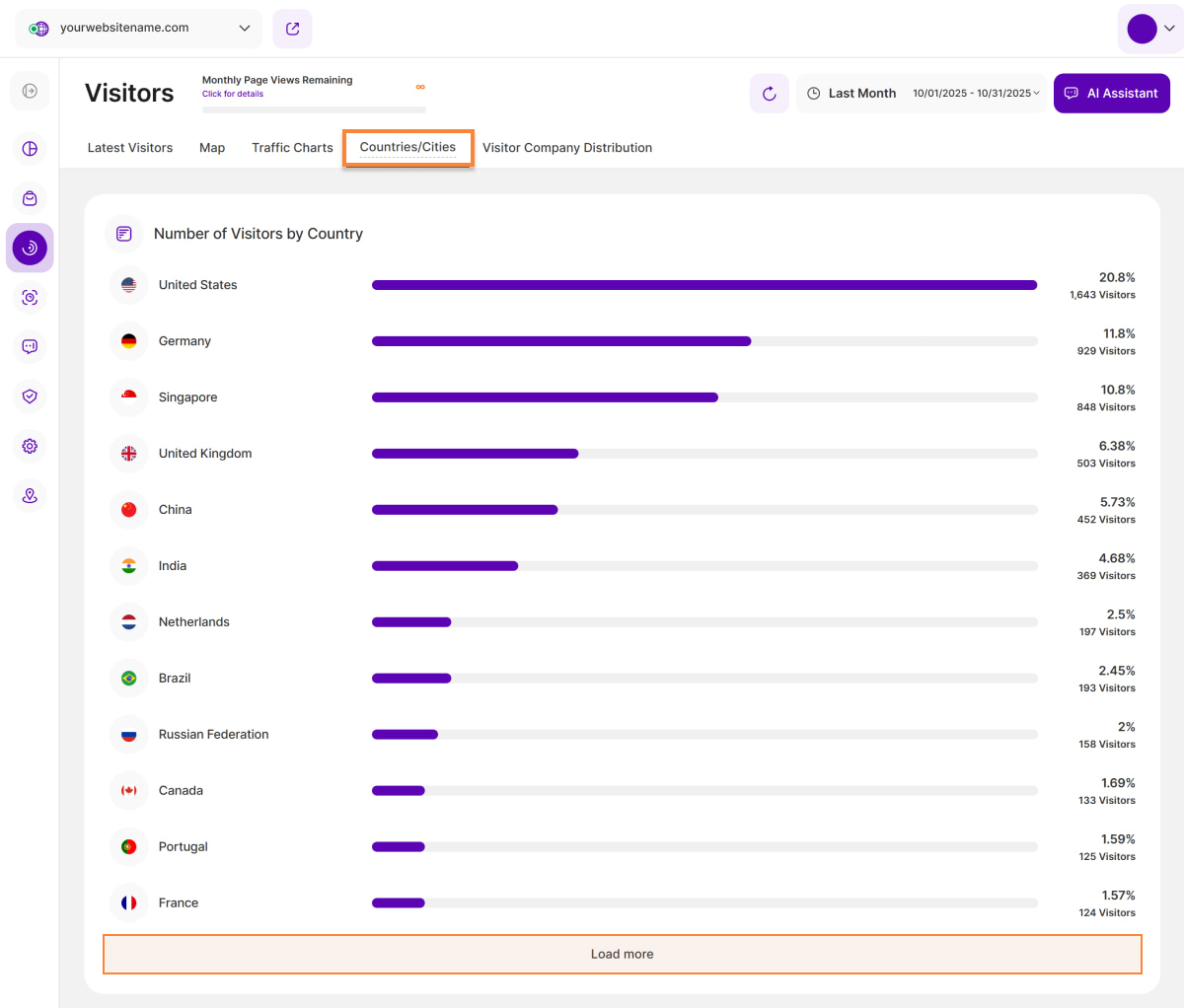 - Percentage: The percentage shown next to each bar indicates the proportion of total visitors attributed to that particular country, helping you gauge the relative contribution of each country to your overall web traffic.
