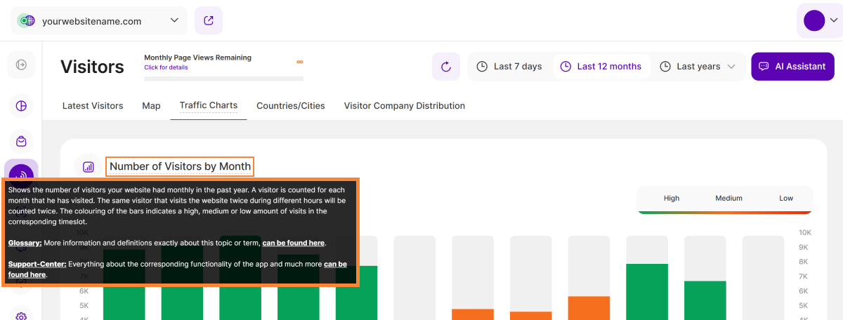 - Number of Visitors by Month: Shows the number of visitors your website had monthly in the selected year. A visitor is counted for each month that he has visited. The same visitor that visits the website twice during different hours will be counted twice. The colouring of the bars indicates a high, medium or low amount of visits in the corresponding timeslot.